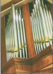 The pipe organ, built by Quimby Pipe Organs, Inc., is a three manual instrument of 27 ranks. The Great and Swell are located at the front of the church, above and to the right of the rostrum area, behind a facade of speaking and non-speaking Principal pipes. The Pedal 16' wood Subbass forms a functional display on the opposite front side. Both Great and Swell employ Quimby-style electro-pneumatic slider windchests. An Echo division from the previous Austin organ was redesigned and located in its existing chamber, speaking into the balcony.